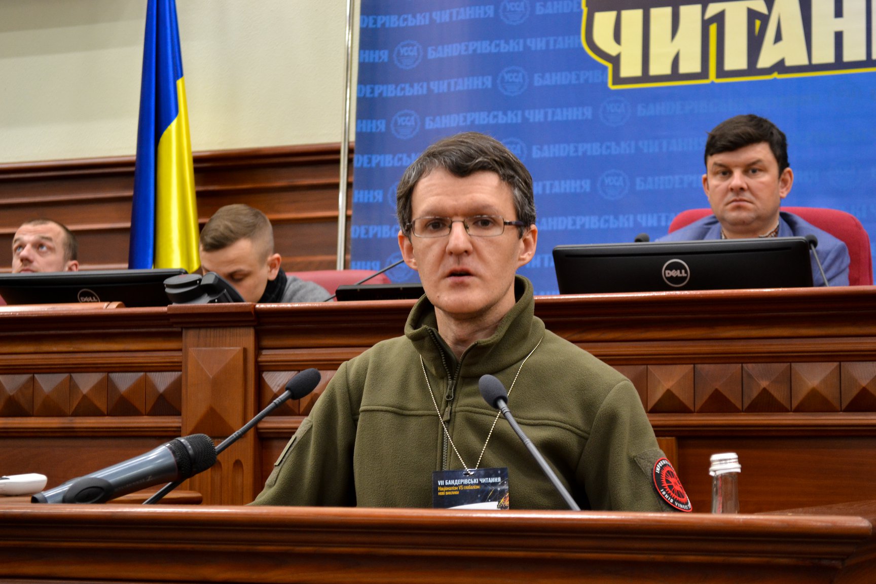 На VII Бандерівських читаннях лунає не лише українська. Редактор білоруського офісу ІнформНапалм Дзяніс Івашин доповідь про підготовку Російською Федерацією прямої агресії щодо Білорусі виголошує рідною білоруською. Жоден присутній не заперечує.