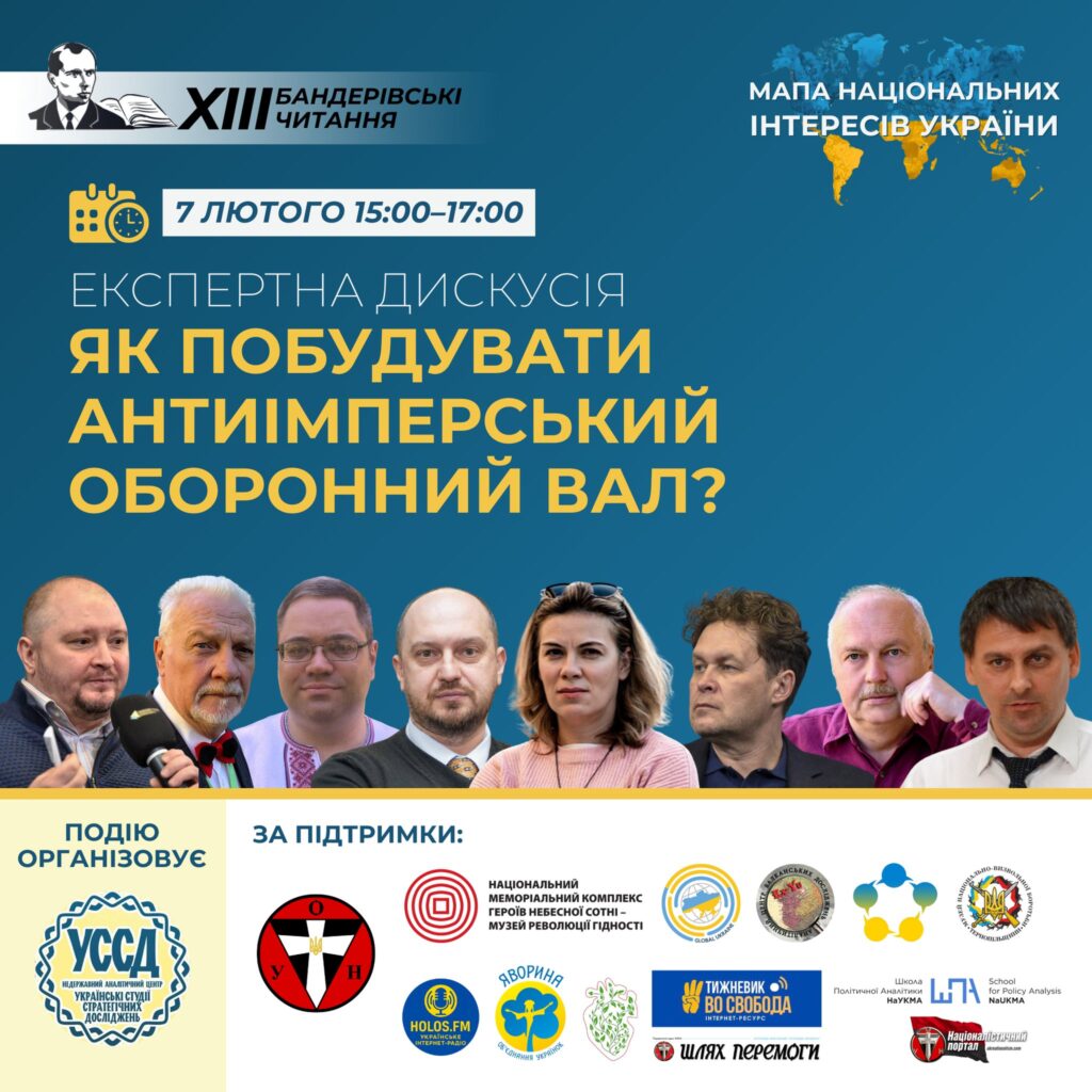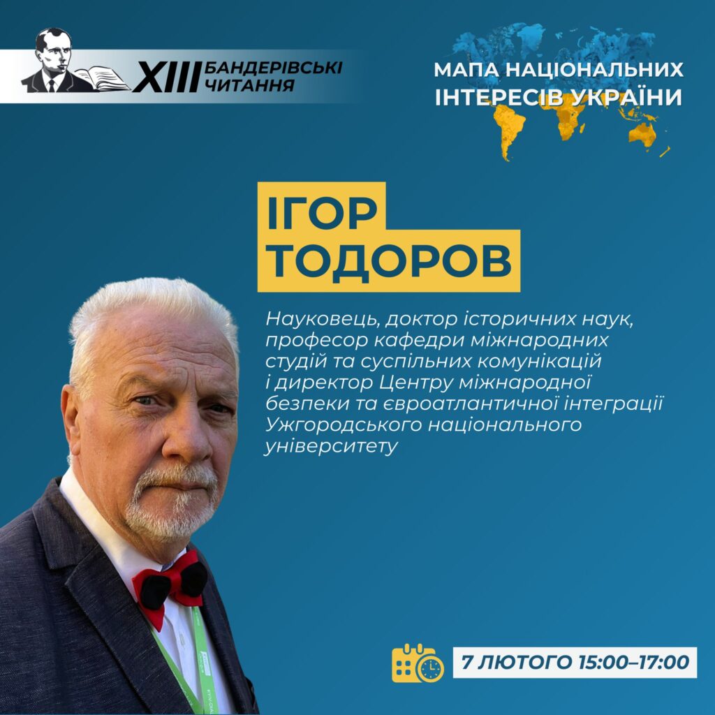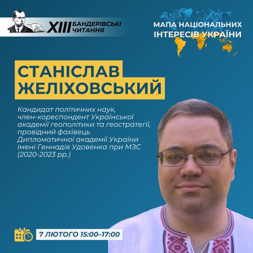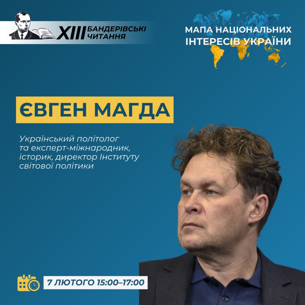 Нагадуємо, що 7–8 лютого відбудуться ХІІІ Бандерівські читання на тему «Мапа національних інтересів України». Це простір фахової розмови, де в режимі відкритої експертної дискусії буде чітко й аргументовано окреслено національні інтереси та зовнішньополітичні пріоритети України.
