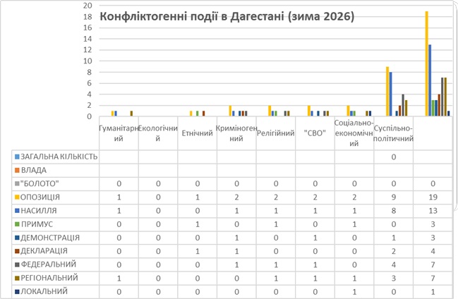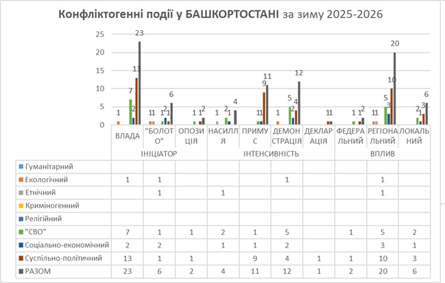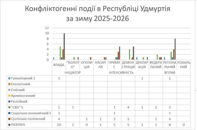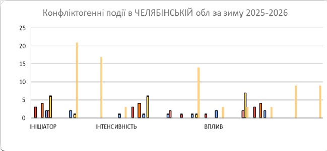 Упродовж зими 2025-2026 рр. у Челябінській області за відкритими даними була зафіксована 21 конфліктогенна подія. Найбільше їх сталося у суспільно- політичній (7), криміногенній, військовій та гуманітарній сферах (по 4), найменше – у соціально-економічній(2).