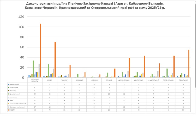 За зиму 2025/26 року за результатами моніторингу повідомлень у відкритих джерелах (ЗМІ, соцмережі, месенджери тощо) зафіксовано 106 подій, що містять в собі конфліктогенні ознаки та мають деконструктивний вплив звітний регіон.